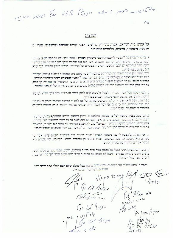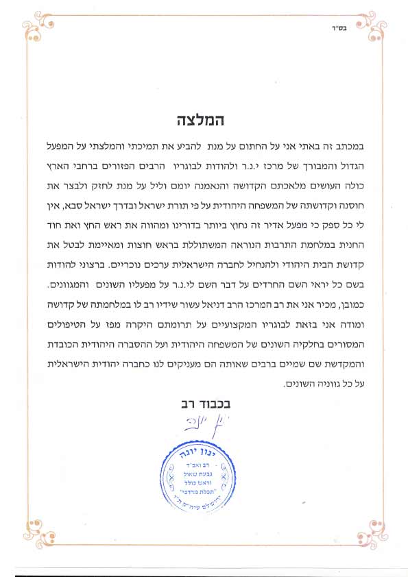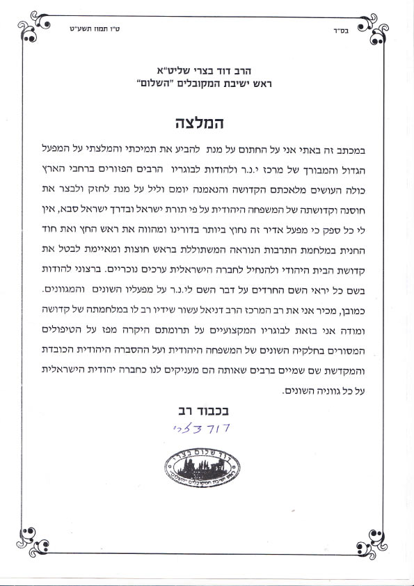 כבר ראיתי חתימות גדולי ישראל ששיבחו את הארגון הנ"ל. לעצם הפעולות הנעשות על ידי הארגון ועל כך שהם עומדים בקשר הדוק עם מורי הוראה מובהקים אשר יכוונו דרכיהם הברוכות. וגם אמרתי להצטרף ולהאדיר את שמו של ארגון זה ואני תפילה כי יזכו להוציא לפועל מזימתם הברוכה ולהעמיד הבית היהודי על מכונו.