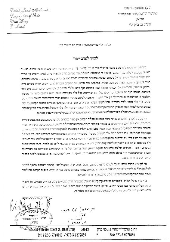 מכתב המלצה מהרב חיים זאיד, הרב המקומי פרדס כץ קרית הרצוג, ר"מ ישיבת נחלת שלמה , בני ברק.